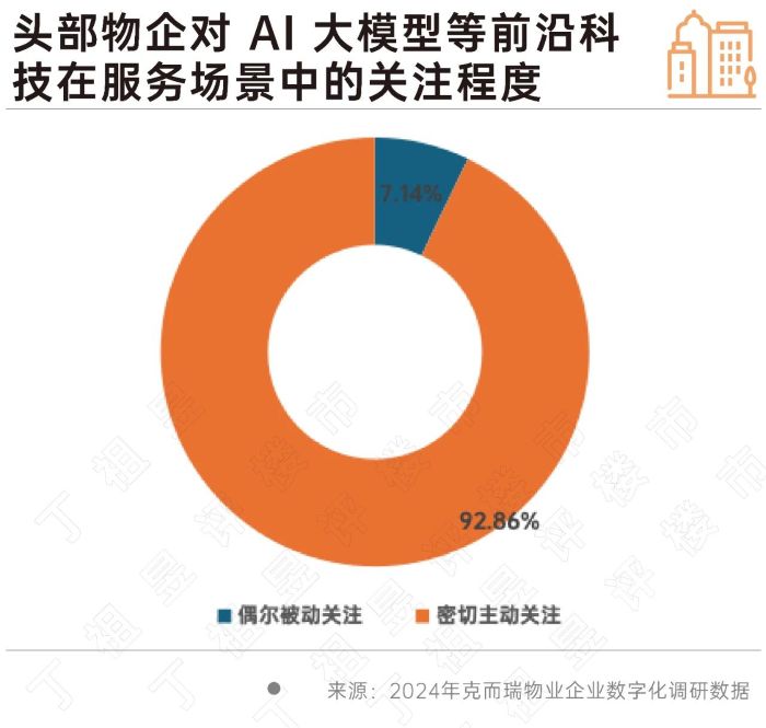 同时,克而瑞物管调查显示,2024年,92.86%的头部物业企业高度关注AI大模型的行业落地,42.86%的企业已将其应用于具体业务场景,推动数字化管理取得实质性突破。
